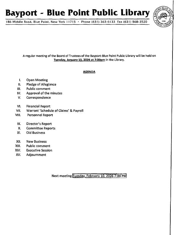 Regular scheduled Board of Director’s meetings of the Bayport-Blue Point Public Library will be held in the Library at 7:00 pm on the following dates: